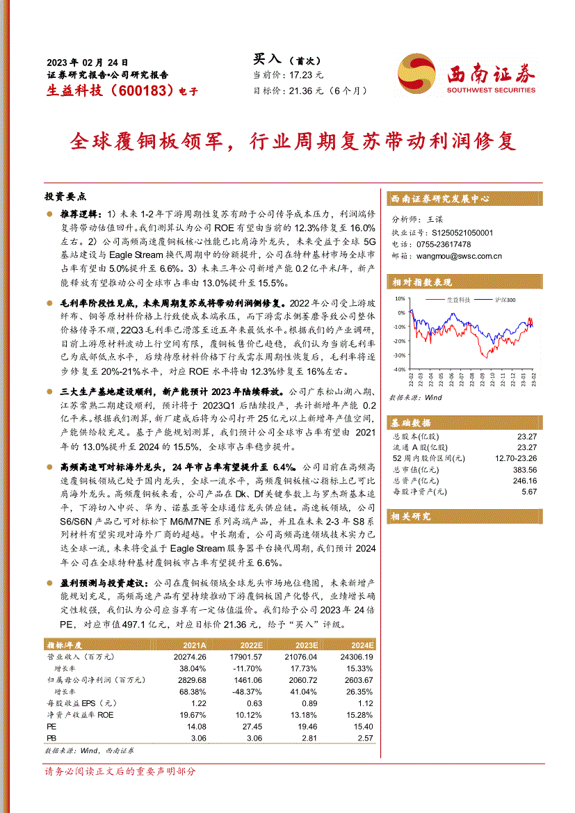 2023年02月24日 证券研究报告公司研究报告买入(首次) 当前价:17.23元生益科技(600183)电子 目标价:21.36元(6个月) 全球覆铜板领军,行业周期复苏带动利润修复投资要点西南证券研究发展中心 分析师:王谋执业证号:S01 电话 邮箱:相对指数表现数据来源:Wind 基础数据 总股本(亿股) 23.27 流通A股(亿股) 23.27 52周内股价区间(元) 12.70-23.26 总市值(亿元) 383.56 总资产(亿元) 246.16 每股净资产(元) 5.67 相关研究 推荐逻辑:1)未来1-2年下游周期性复苏有助于公司传导成本压力,利润端修复将带动估值回升。