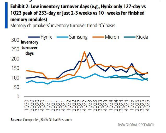 首先,库存水平已经降至“警戒线”以下。以SK海力士为例,其库存周转天数已从2023年一季度的233天峰值,大幅下降至仅127天。更惊人的是,成品存储模组的库存仅能维持2-3周,而正常水平通常在10周以上。这意味着,一旦需求稍有波动,供应链将面临极大的缺货压力。